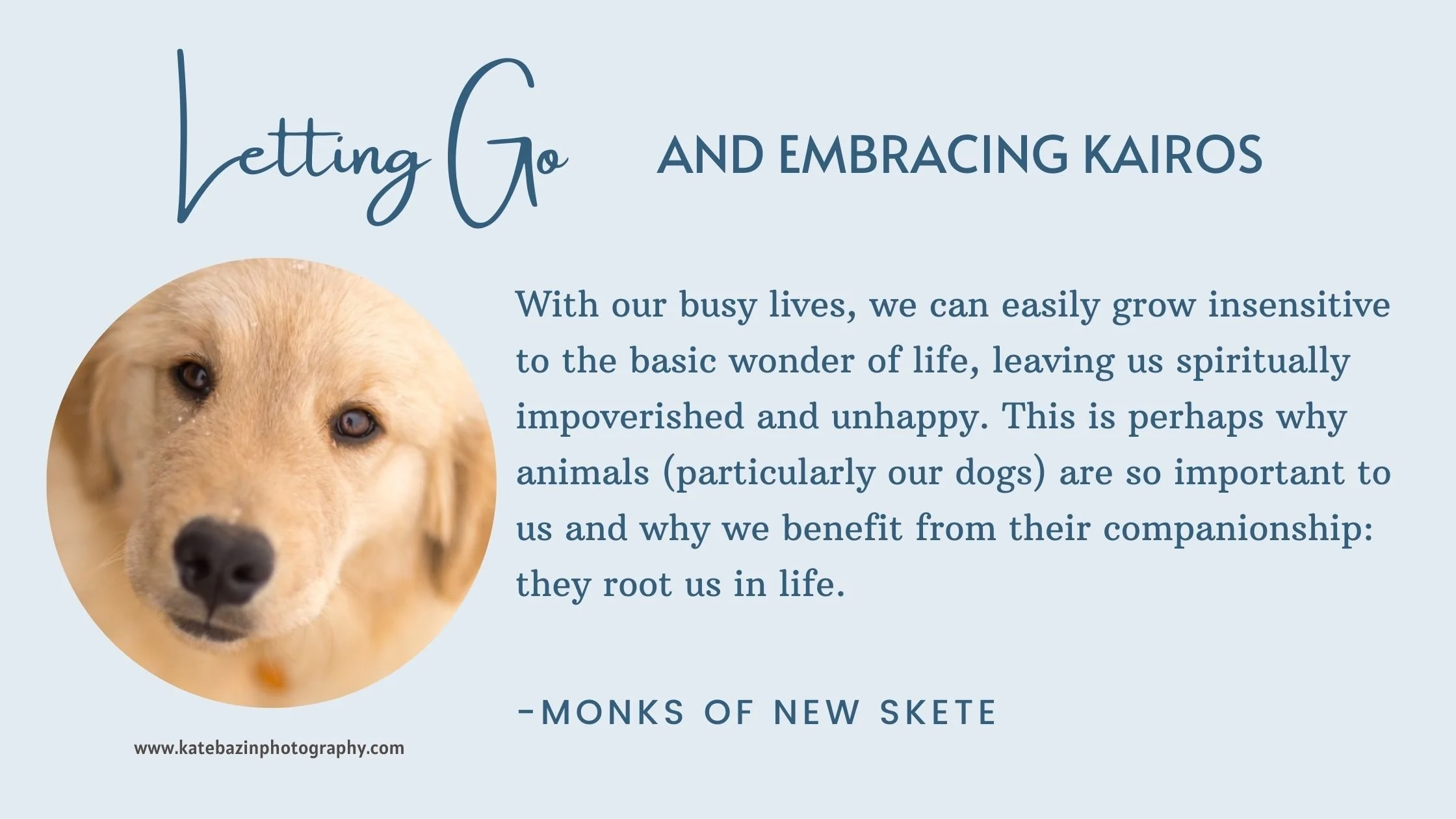 Through prayer, I re-rooted myself in Christ and soothed myself with a litany of “blessed be the Lord…the peace in my soul is from the Lord…blessed be the Lord… the peace in my soul is from the Lord…” I hoped that if my mind said it enough, my heart would comply. I allowed Christ to move my heart into a space of gratitude, gratitude for all that Kairos was and all the joy he brought us. I recalled a passage from the Art of Raising a Puppy by the Monk’s of New Skete. They wrote: